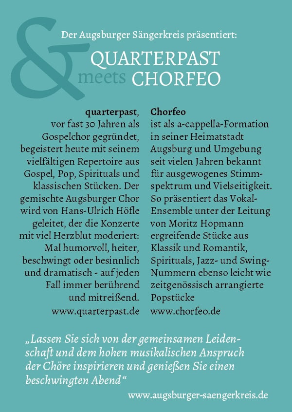 „Lassen Sie sich von der gemeinsamen Leidenschaft und dem hohen musikalischen Anspruch der Chöre inspirieren und genießen Sie einen beschwingten Abend!“
